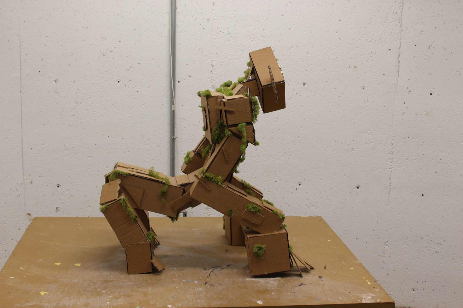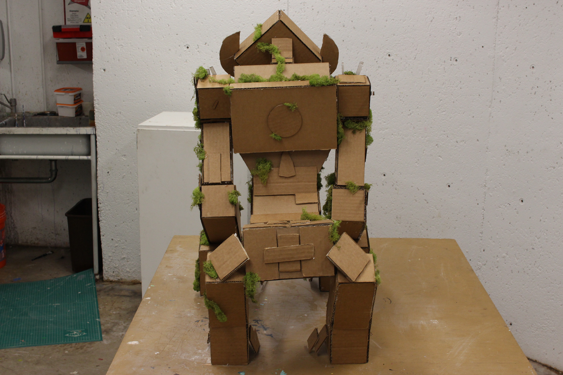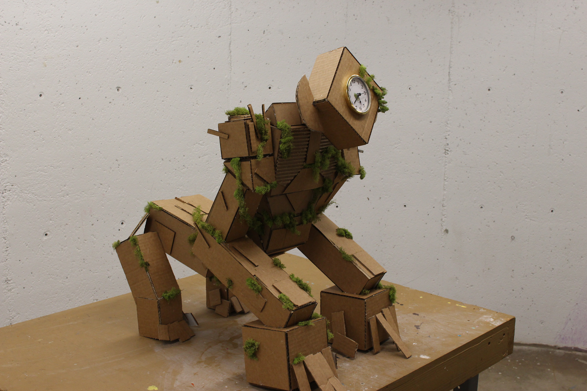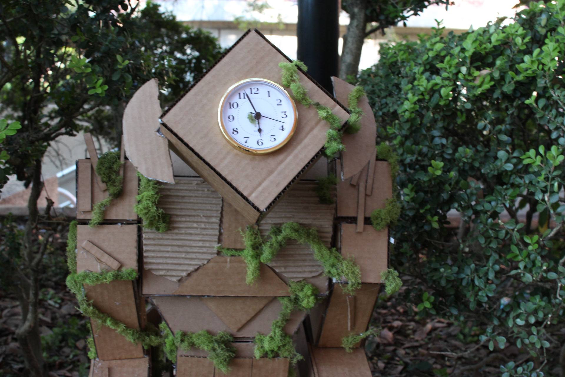 Clock Monkey was a project from Spring 2024. He was designed as part of an egg-drop assignment for a 3D Foundations art class, taking roughly 30 hours. He was made with intention that I would be putting him back together after the egg-drop had been finished. The egg was held in the rectangle on his back, held in place on a small shelf and stuffing.